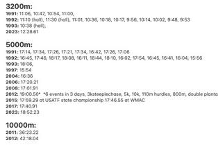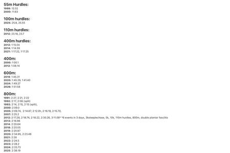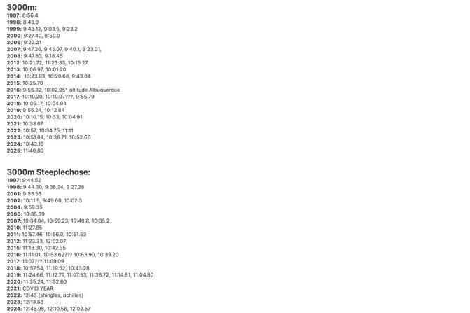 2012: 2:17.28, 2:18.74, 2:18.22, 2:30.26, 3:11.08* *6 events in 3 days, 3ksteeplechase, 5k, 10k, 110m hurdles, 800m, double plantar fasciitis