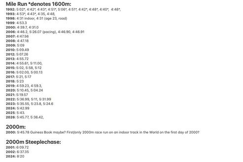 1998: 4:31 indoor, 4:31 (age 23, road)